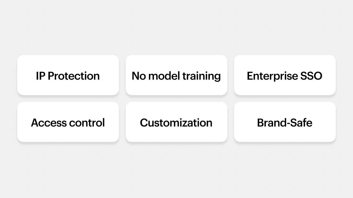 Your content stays yours. Nothing you create is used to train models, and your IP remains protected. Enterprise-grade SSO, access controls, and brand customization let teams move fast—without legal overhead.