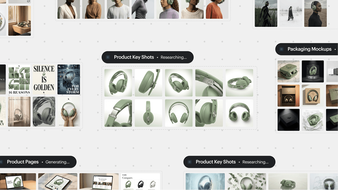 Create image, video, and sound in one place—developed together, in context. From campaigns to product stories, everything stays connected from brief to delivery. No tool sprawl. No broken handoffs.